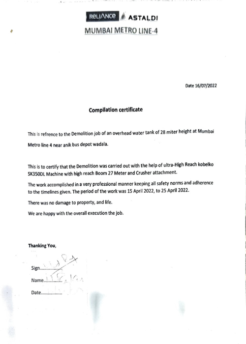 Demolition job of an overhead water tank of 28 miter height at Mumbai Metro line 4 near anik bus depot wadala.